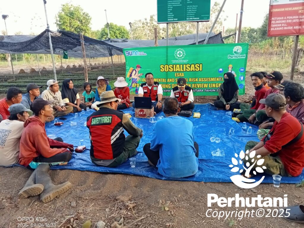 BANYUWANGI UTARA, PERHUTANI (01/10/2025) | Perhutani Kesatuan Pemangkuan Hutan (KPH) Banyuwangi Utara menggelar Sosialisasi Environmental and Social Risk Assessment (ESRA) kepada para pesanggem terkait penggunaan pestisida kimia dan Bahan Berbahaya Beracun (B3) di kawasan hutan yang dilaksanakan di lokasi persemaian Bagian Kesatuan Pemangkuan Hutan (BKPH) Bajulmati pada Rabu (1/10).