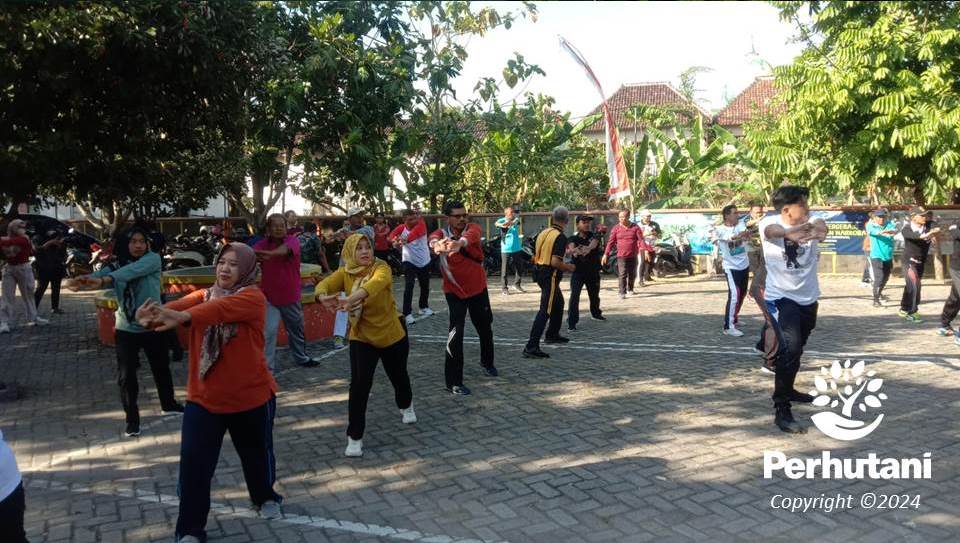KEBONHARJO, PERHUTANI (09/08/2024) | Perum Perhutani Kesatuan Pemangkuan Hutan (KPH) Kebonharjo yang diwakili Bagian Kesatuan Pemangkuan Hutan (BKPH) Gayam mengikuti olahraga senam pagi bersama stakeholder di halaman Kantor Kecamatan Bogorejo, Jumat (09/08).