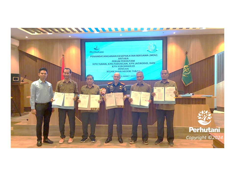 TUBAN, PERHUTANI (26/03/2024) | Perhutani Kesatuan Pemangkuan Hutan (KPH) Tuban bersama dengan KPH Jatirogo, KPH Parengan, dan KPH Kebonharjo yang berada dalam wilayah Kabupaten Tuban melakukan kesepakatan di bidang Perdata dan Tata Usaha bersama Kejaksaan Negeri yang ditandai dengan penandatangan Memorandum of Understanding (MoU) di Kantor Kejaksaan Negeri Tuban (26/3).